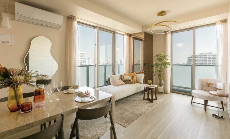 MODEL ROOM WORKS Brillia Tower Ariake MID CROSS 一日の緊張を解きほぐす、エスプリの効いたシティリゾートスタイル。 穏やかなベージュトーンに、大理石の質感と自然感が漂うラスティックなペールホワイトとグレージュオーク、イタリアンウォールナット材を組み合せた空間。 都心に住まうリゾート派に向けた、エレガントクリエーティブな空間を演出しました。